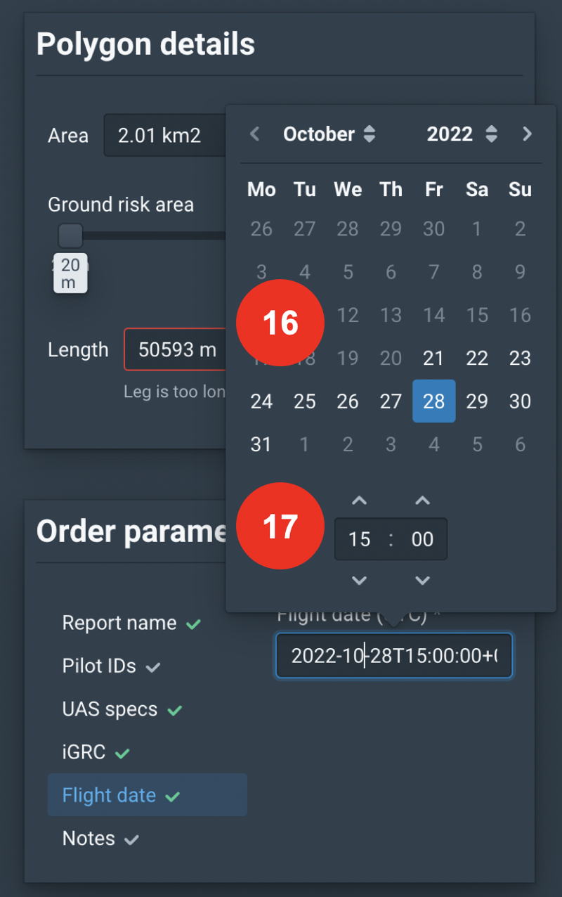 Podaj datę (16) i godzinę misji (17) czasy w UTC Podane w tym miejscu data i godzina pojawią się w raporcie. Pamiętaj, że nie ma możliwości zrobienia raportu wstecznie.
