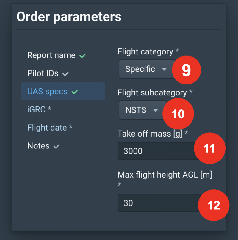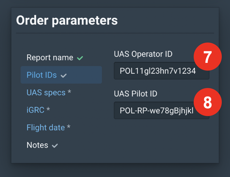 Jeśli wcześniej wpisałeś/-aś w profilu użytkownika numer Pilota (7) i Operatora (8) system automatycznie uzupełni te pola. Jeśli nie, podaj tutaj swoje dane