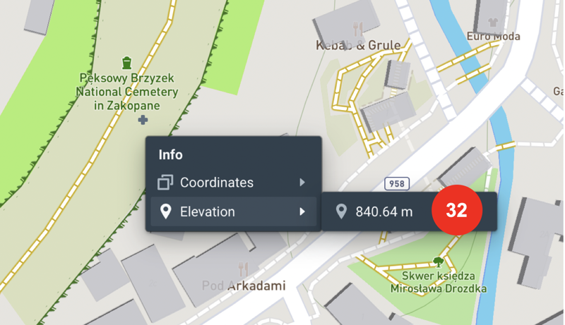 W widoku mapy, można za jednym kliknięciem sprawdzić elewację powierzchni lub obiektów naziemnych. Należy najechać kursorem na dane miejsce, kliknąć prawy guzik, a następnie z menu kontekstowego wybrać pozycję „Elevation”. W okienku pojawi się Elewacja (AMSL – nad poziomem morza) we wskazanym kursorem punkcie.